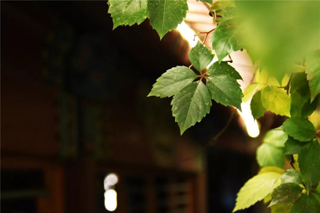 秋月宁静,微风轻柔,柔弱的月光与灯光融合一体,隐隐约约,朦朦胧胧,用光影描绘出长廊的轮廓。长廊上方爬满了藤蔓,明月透过缝隙投下星光,如同银河一般。