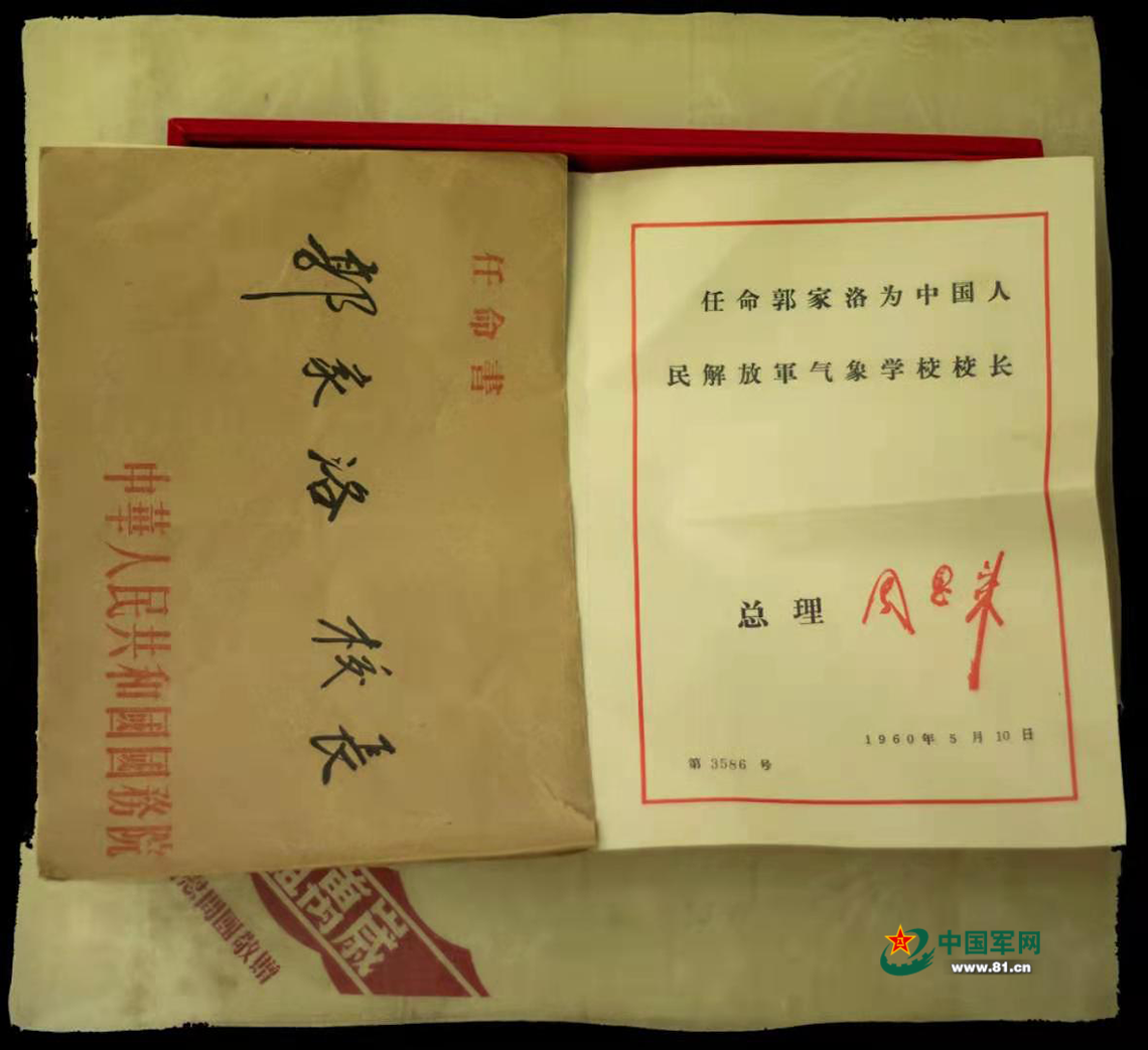 在气象海洋学院的院史馆里,展陈着这样一张任命书:“任命郭家洛为中国人民解放军气象学校校长。总理:周恩来。”泛黄的纸页、朱红的签名,让那段难忘的岁月再度浮现。