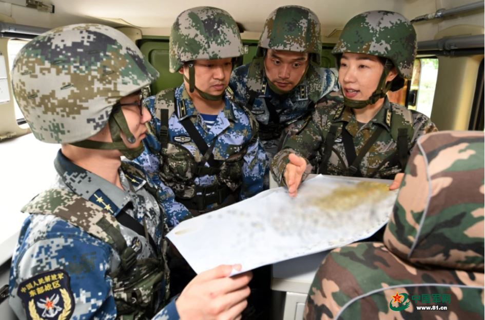 葛晶晶在野外机动作业时进行天气会商
