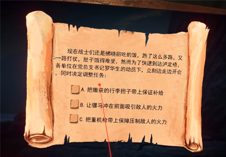 这是七十年前,中央红军在向泸定桥前进时所面临的困境;也是如今国防科大系统工程学院创作的《“红军长征之飞夺泸定桥”虚拟仿真实验教学课件》中的一道选择题。在教员杨清清的课堂上,只需一副vr眼镜,一个遥控手柄,就能瞬间将你带入那场荆棘载途又荡气回肠的战役。全方位体验的过程中,操控手柄进行战略决策、在危机关头排布精兵良将和强攻硬弩,冒着枪火在战场上对敌人精准射击,都是学员们的必经关卡。这不仅是一堂生动的课程,更像一场需要斗智斗勇的“密室逃脱”游戏。最终,为了减轻行军重量,红军选择卸下所有的粮草,连水都没有留下,带上武器,向泸定桥全力进发……