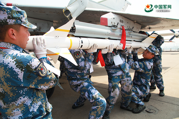 “开始换弹!”听到机械师黄楷闻的洪亮口令,付雷迅速跑到机翼后侧,扛起一枚航空导弹,与机翼前侧的同学付家旺配合,努力对准导弹和机翼上那两个直径只有几厘米的螺栓孔……