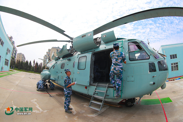 学员对直升机进行检查。