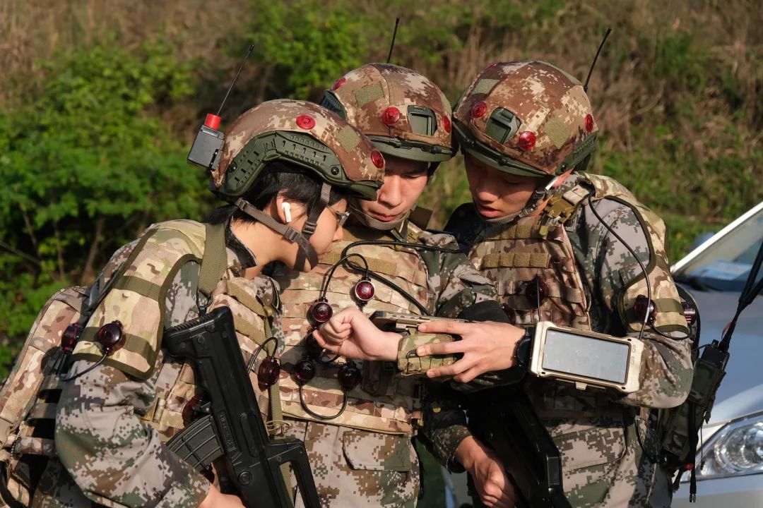 “出动无人机侦察!” 演练一开始,红军指挥员王立轩一声令下,侦察无人机迅速起飞,有人-无人协同作战系统开启。无人机侦察到的战场态势信息第一时间传达到了红军手臂上的手持终端,他们分为突击小队、无人小队、奇袭小队,协同地面察打一体无人车,兵分两路对蓝军营地发起了进攻。