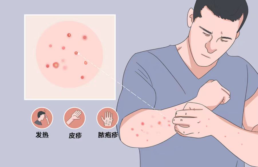 出痘期:2-4周,皮疹经历从斑疹、丘疹、疱疹、脓疱疹到结痂几个阶段的变化,多呈离心型分布,出疹的第一周传染性最强。