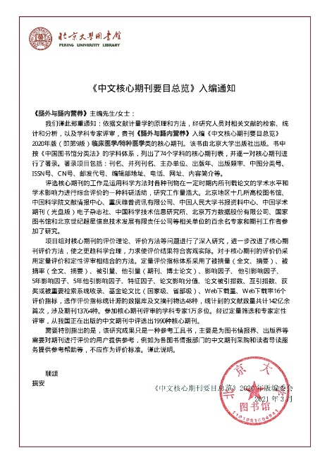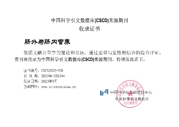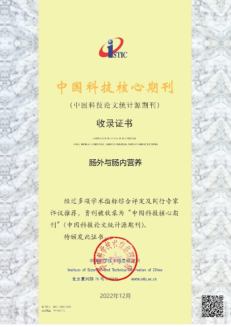 在自然科学领域,CSCD、中国科技核心期刊、北大中文核心期刊目录是国内三大核心期刊体系,是国内科研机构用来进行学术评价的主要参考依据。《肠外与肠内营养》自创刊以来,多次入选国内公认的三大核心期刊数据库,目前已经连续5年同时为CSCD核心期刊、中国科技论文统计源期刊、北大核心期刊。先后被中国学术期刊综合评价数据库(CAJCED)、中国生物医学文献数据库(CBM)、RCCSE中国核心学术期刊、美国《化学文摘》(CA)、JST日本科学技术振兴机构数据库(日)等国内外知名文献数据库收录,多次荣获全军“优秀学术质量奖”、省“优秀参展期刊”等奖项。