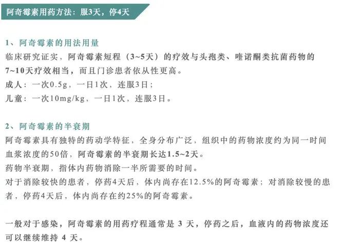 阿奇霉素的使用必须严格遵循医嘱。考虑到阿奇霉素具有独特的药动学特征,全身分布广泛,组织中的药物浓度约为同一时间血浆浓度的50倍,阿奇霉素的半衰期长达1.5~2天。对于消除较快的患者,停药4天后,体内尚存在12.5%的阿奇霉素,对消除较慢的患者,停药4天后,体内尚存在约25%的阿奇霉素。综合以上因素,我们不难发现,阿奇霉素的用药疗程通常是用3天,停4天。