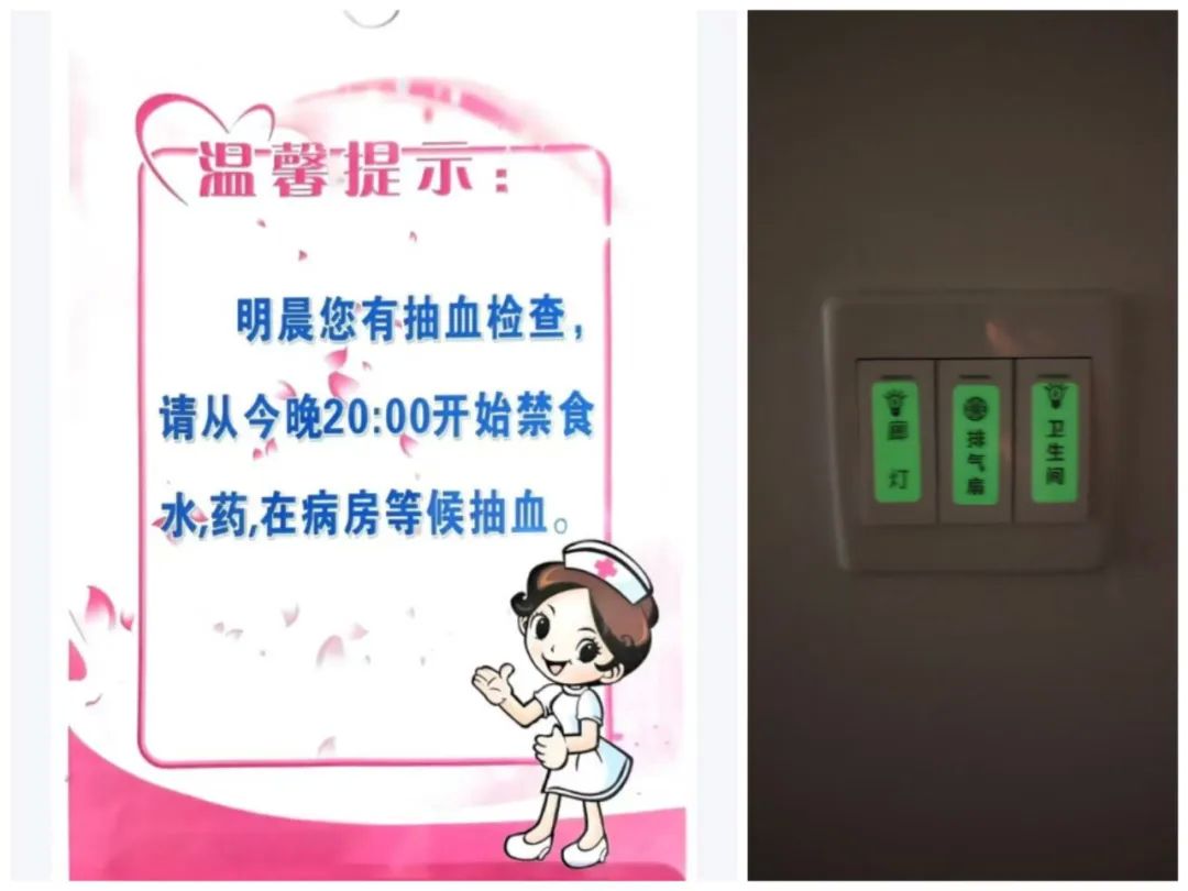 为营造优美、温馨的就医环境,该科在病区和走廊内摆设绿色盆景植物与书画作品,为了防止病人在夜间起床因光线昏暗发生意外,我们在开关处创新性贴上夜光贴,传递出无微不至的关怀。根据患者的病情和治疗阶段的不同,专门为患者制作个性化的温馨提示牌:如遇患者第二天有抽血时,温馨提示语为“明早您有抽血检查,请从今晚20:00开始禁食、水、药”;如遇患者第二天准备手术,温馨提示语改为“您明天已经安排手术,不要紧张,今晚一定保证充足的睡眠”等,让患者随时参与到治疗过程当中。