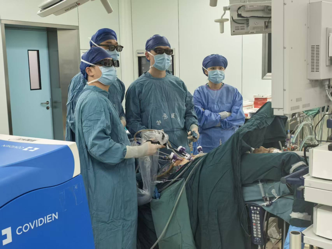 手术正式开始,由杨诏旭教授主刀,彭伟等医师担任助手。和之前预想的一样,腔镜下腹腔粘连严重,分离过程中采用先易后难,层层递进方式,抽丝剥茧一般剥离粘连组织,精准操作同时还要保护好重要血管,任何细微操作容不得一丝失误。在3D腹腔镜放大视野下,手术团队凭借熟练的腔镜技巧及默契配合,开启了这场精细的极限操作。