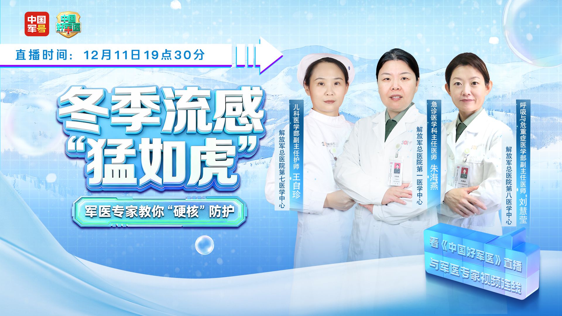 冬季流感来势汹汹!鼻塞、咳嗽、肺炎、反复发烧怎么办?流感和普通感冒如何区分?哪些是必须警惕的流感重症信号?……12月11日晚19:30,中国军号《中国好军医》直播间将邀请解放军总医院专家团队:第一医学中心急诊医学科主任医师朱海燕、第七医学中心儿科医学部副主任护师王自珍、第八医学中心呼吸与危重症医学部副主任医师刘慧莹三位权威专家,为您全方位解析流感的科学防护、症状应对和居家护理。