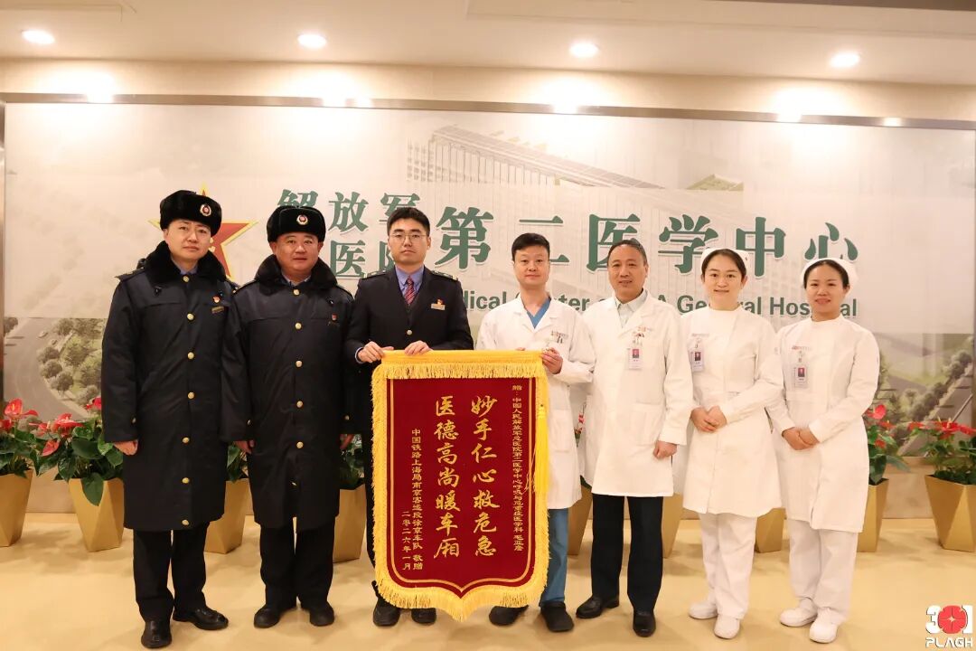 1月24日,上海铁路局南京客运段徐京车队党支部书记马璇东、列车长丁志庆、列车员孙忠强,专程从徐州奔赴北京,带着患者和家属以及铁路部门的诚挚谢意,来到解放军总医院第二医学中心,向毛亚詹同志献上锦旗。这份真诚的谢意,背后是一个“列车施救”的故事。