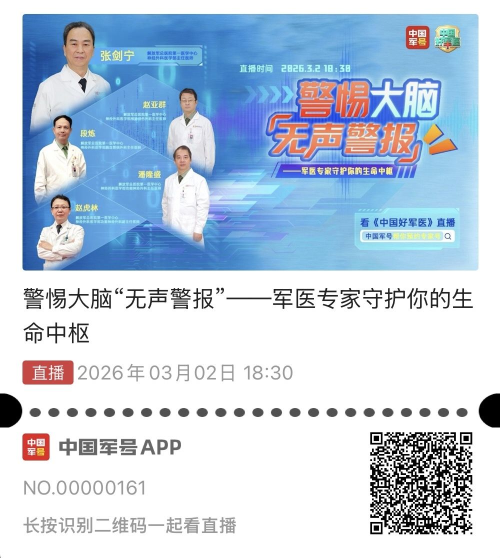3月2日晚18:30,《中国好军医》特邀解放军总医院第一医学中心神经外科医学部权威专家团队,一次性讲透大家最关心、最容易混淆的五大疾病:听神经瘤:别把听力下降、耳鸣不当回事