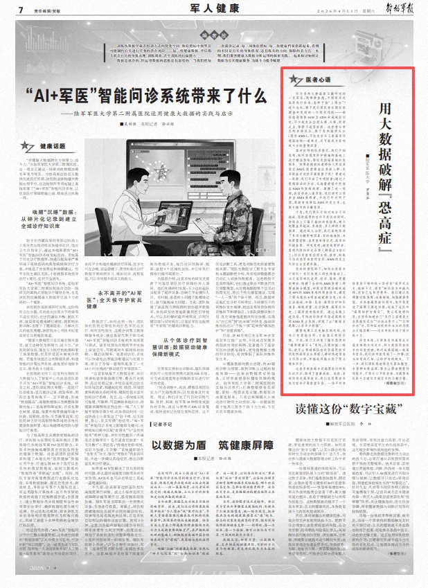 回望来路,从聚焦急性高原反应高发难题立项攻关,到大数据筛查技术的研发突破,再到成果落地一线服务官兵,我们其实就是做了一件事:把未知变成已知,让防护有的放矢。下一步,我们团队将继续优化算法模型、丰富样本数据库,努力让筛查精度持续提升、干预关口不断前移,为高原部队战斗力建设贡献坚实的卫勤力量。