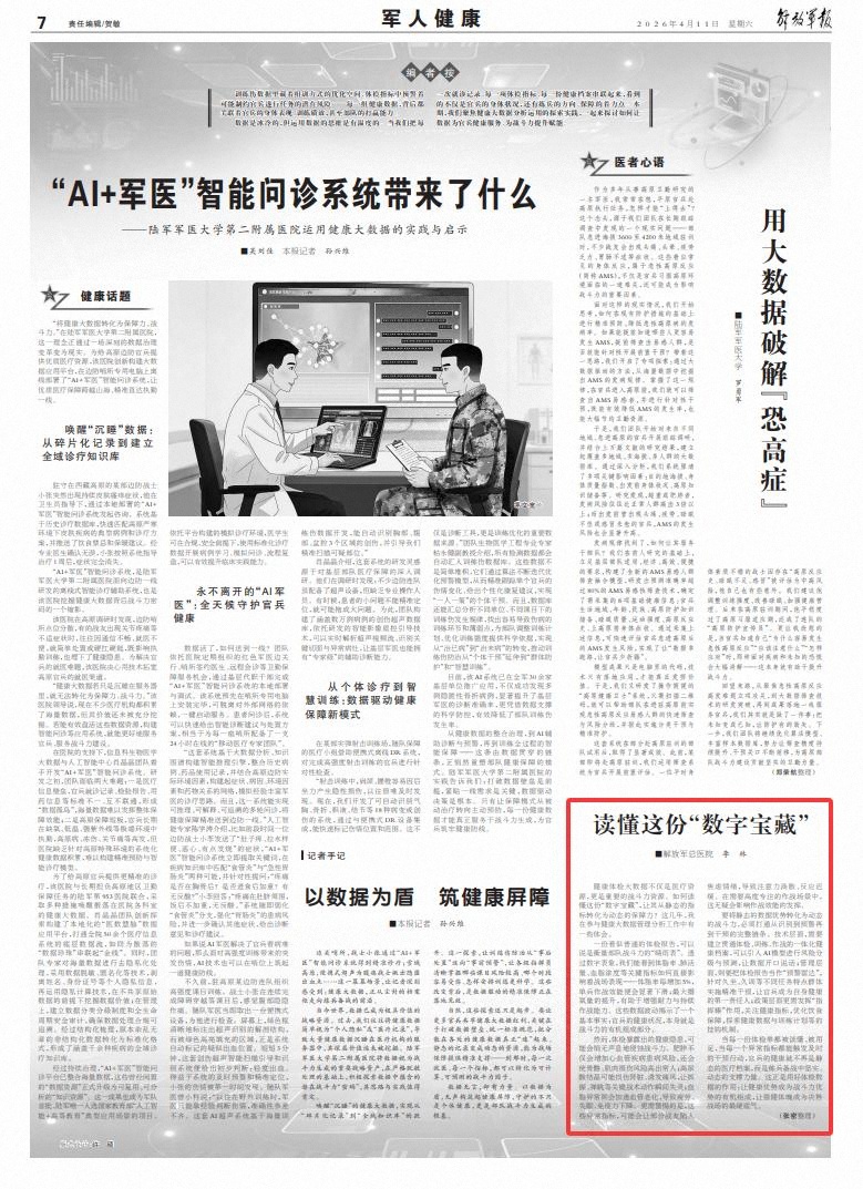 当每一份体检单都被读懂、被用足,当每一个异常指标都能触发及时的干预行动,官兵的健康就不再是静态的医疗档案,而是练兵备战中坚实、动态的支撑力量。这正是用好体检数据的作用:让健康优势成为战斗力优势的有机组成,让强健体魄成为决胜战场的最硬底气。