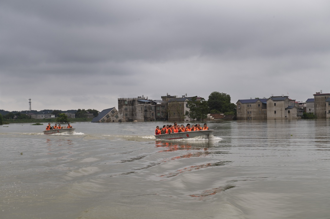 7月21日,火箭军某基地医疗队队员乘冲锋舟前往被洪水围困的鄱阳县油墩街镇晏桥村巡诊。新华社发(刘明松 摄)
