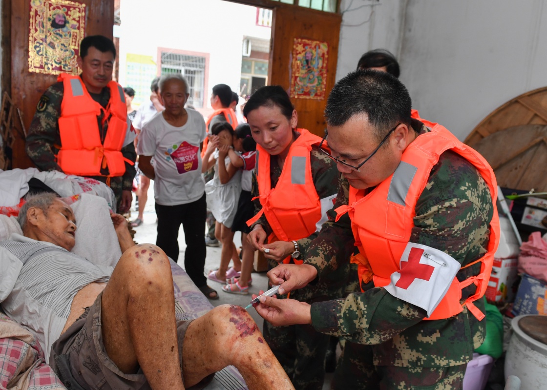 7月19日,火箭军某基地医疗队队员在被洪水围困的鄱阳县油墩街镇港湖村救治不慎摔伤的91岁老人。新华社发(刘明松 摄)