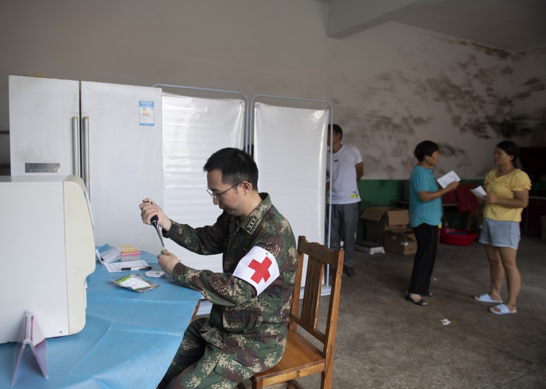7月21日,火箭军某基地医疗队队员在被洪水围困的鄱阳县油墩街镇晏桥村为村民义诊。新华社发(刘明松 摄)