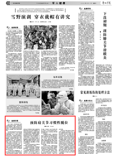 如果官兵不慎出现肩关节脱位,应第一时间停止关节活动,用毛巾、三角巾或腰带将前臂吊于胸前,使上臂保持内收、内旋,肘关节屈曲90度,然后及时送医治疗。肩关节复位的方法虽然简单,但对施行者的技能和经验要求较高。如果治疗过程中力道和分寸把握得不准确,不仅起不到治疗效果,还容易造成二次伤害。因此,肩关节脱位后,切不可盲目复位,应尽快找有经验的军医或卫生员帮助复位。复位后用肩吊带保护,将肩关节固定四周左右,让患处有充足的恢复时间。之后根据个人恢复情况,在医生指导下进行适应性锻炼,逐步恢复患处的机体功能。如果肩关节脱位3次以上,建议尽早进行手术干预, 可通过创伤小、恢复快的关节镜方式进行韧带和盂唇的修复。