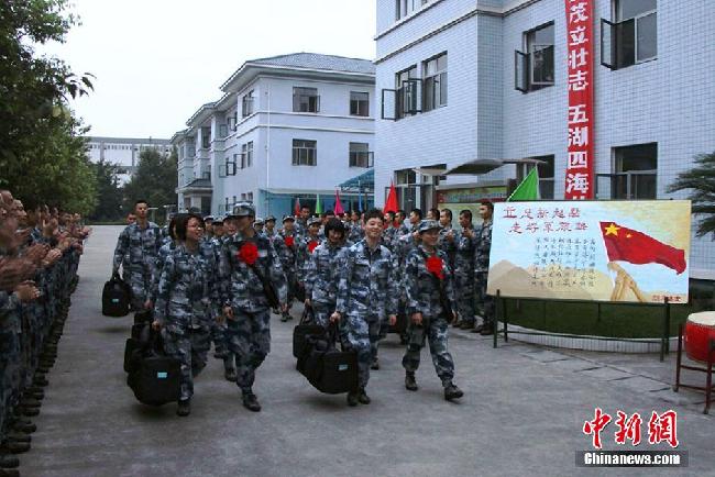 女兵们陆续来到新兵连,战友们敲锣打鼓列队欢迎。易开红 摄