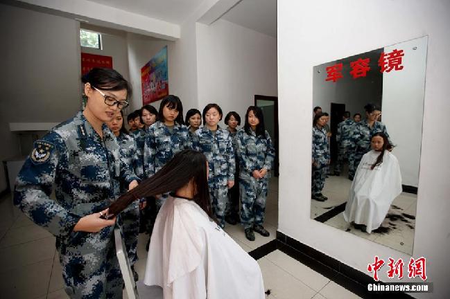 部队不能留长发,从未剪过发的新兵王杨,看到自己的秀发被剪短了,还是有些不舍。易开红摄