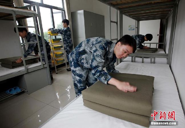 起床,叠被子,几分钟的时间,被子就已在她们手中成了一块块有棱有角的“豆腐块”新兵吴若愚第一次将被子叠成豆腐块,成就感十足。易开红 摄