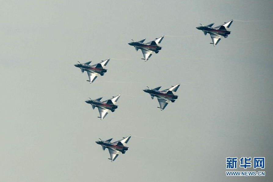 11月11日,女飞行员参与飞行的中国空军八一飞行表演队驾驶歼-10进行飞行表演。新华社发(沈玲 摄)