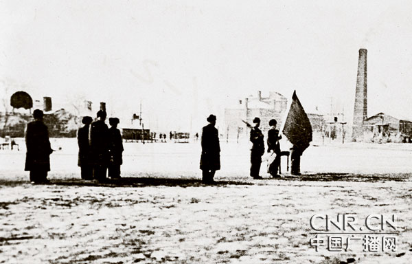 根据中央军委的命令和空军的通知,各航校陆续举行成立大会,图为第一航校举行授旗仪式。