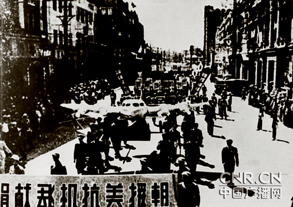 手持“捐献飞机抗美援朝”标语的游行队伍