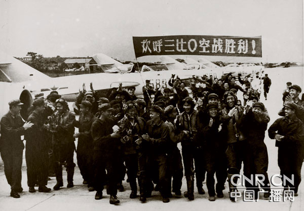 1958年7月29日,空军某师以“三比零”的战果取得入闽作战的首次胜利。这是参加空战的4名飞行员。左起:赵德安、高长吉、黄振洪、张以林热烈欢庆“三比零”空战胜利