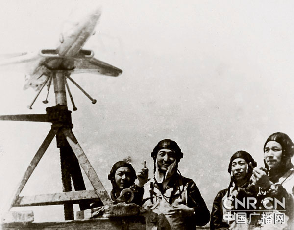 1968年1月20日,空军某师作战分队副大队长韩永武和飞行员周永成,在2万米高空使用歼-7型飞机击落美国无人驾驶高空侦察机1架。图为韩永武(左二)在介绍击落敌机经过。
