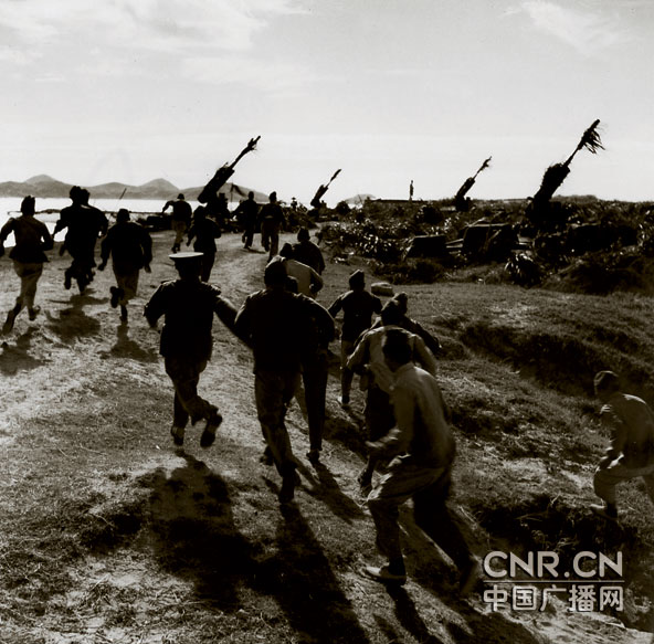 1957年6月12日,空军高射炮兵部队在广东汕头地区上空击伤美海军AD型攻击机1架,击落国民党空军F-84型飞机2架。图为该部指战员听到警报以后迅速进入阵地的情形。