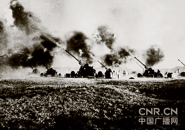 这是高射炮兵某团对窜扰大陆的国民党空军飞机进行射击时的情景