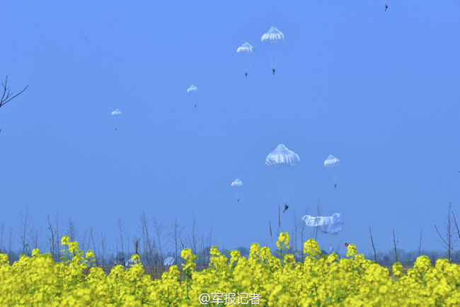 空降兵某部组织伞降训练 伞花油菜花竞相“盛开”