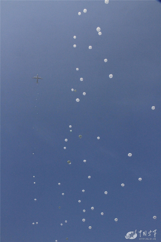 “跳、跳、跳……”空降地域,大风卷云,在投放员指挥下,官兵两路队形、保持间隔,果断离机、鱼贯而出,黄河滩上空朵朵伞花竞相绽放。