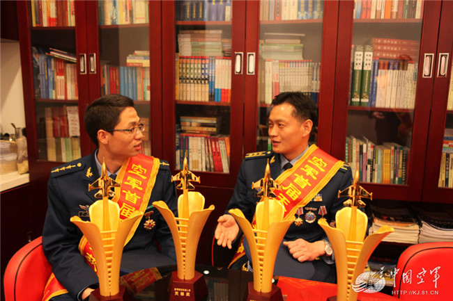 空军首届航空机务人员“天梯奖”安全把关能手、航空兵某部航电师卢凤品和获奖的前辈探讨交流业务。