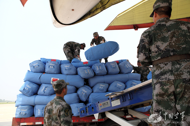 4月28日,空军伊尔-76运输机正在装载帐篷等救灾物资。周建华摄