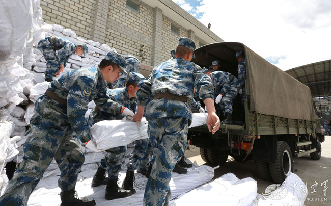 4月26日下午,空军驻藏某指挥所抗震救灾应急分队,把帐篷、棉被等急需救灾物资转送日喀则。 温志军 摄