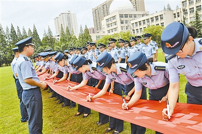 毕业学员在立志戍边的横幅上签名。 本报特约记者 夏效生摄