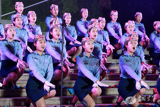 娇俏面庞,甜美声音,飒爽女兵永远是军营里亮丽风景。空军某通信团80余名女兵用一曲《歌唱二小放牛郎》表达对抗战英雄的缅怀,宛转悠扬的歌声令观众感动不已。随后一曲《鸿雁》,配合默契的声部合唱、融入了舞蹈动作的肢体语言、新颖独特的舞台道具,完美诠释了当代通信女兵立足三尺机台,践行“思想最红、业务最精、服务最好”的岗位职责。舞台之上,她们把当代通信女兵不爱红妆爱武装的家国情怀表达得淋漓尽致,也把比赛推向高潮。