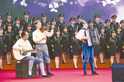 军队老艺术家为受阅部队官兵献艺。