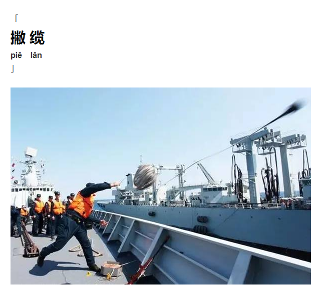 舰船离停码头、海上作业、海上靠泊等都离不开撇缆。然而,粗大的缆绳足足有100多米,太沉重了,为此,我们聪明的航海人在粗缆上,系上一根细缆,用它带动粗缆,帮助舰船更平稳地靠岸。