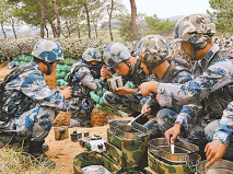 “01!01!我是08,我已在××地域安全着陆,现正组织收集装具……”演练现场,记者看到:炊事人员空降着陆后迅速分组,利用空投的连、排、班用野战给养器材单元和餐份化浅盘食品,展开野战条件下的热食保障。餐份化浅盘食品采用真空包装,包含炒虾仁、土豆烧肉、拌海带丝、麻辣粉丝、蛋炒饭等多种食品,官兵们拆袋后,利用排用野战给养器材单元稍稍加热便可食用,既方便可口又能保证热量营养。