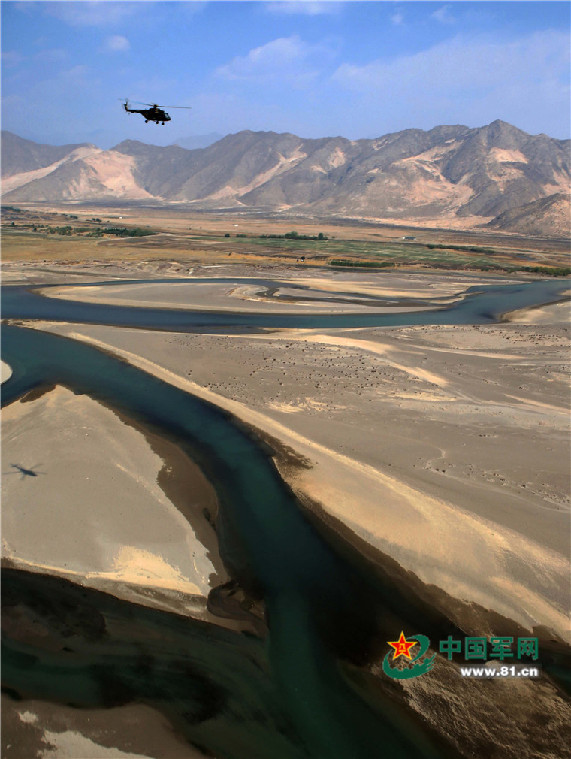 搜救直升机沿着雅鲁藏布江河谷飞行,快速转运“伤员”。
