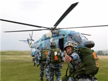 上午10时30分,头戴伞盔,身披伞包和武器装备的跳伞员依次快速登机,两架直升机先后升空,飞向预定投放空域。