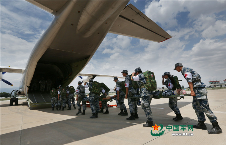 7月22日12时40分,西北某军用机场,4名“重伤员”被医务人员快速转移至军用运输机。梁杰 摄