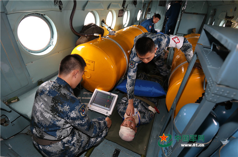 在直升机转运“重伤员”的过程中,医务人员展开相应的抢救措施。刘应华 摄