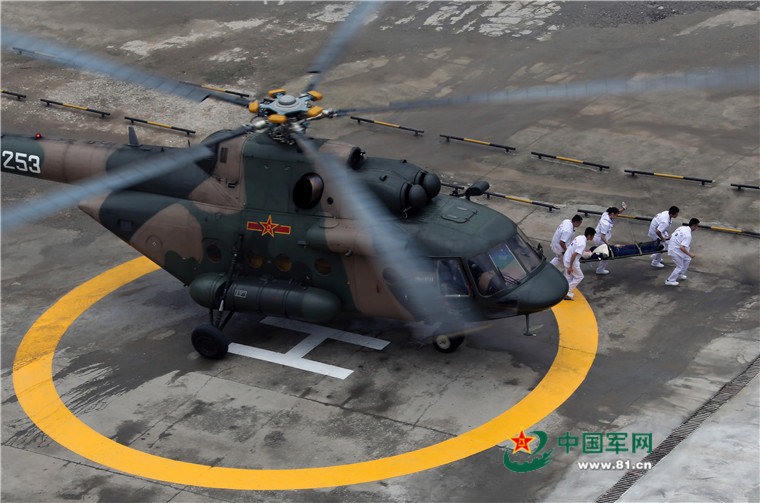 成都军区总医院医务人员从直升机上迅速转移“重伤员”。梁杰 摄