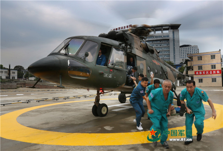 四川大学华西医院医务人员从直升机上抢运“重伤员”。刘应华 摄
