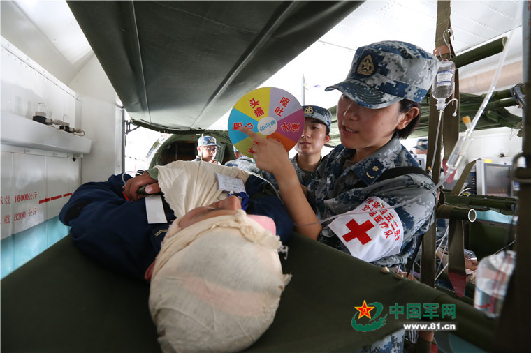 由于运输机的噪音较大,“重伤员”的听力受影响,医务人员用询问牌向伤员示意。梁杰 摄