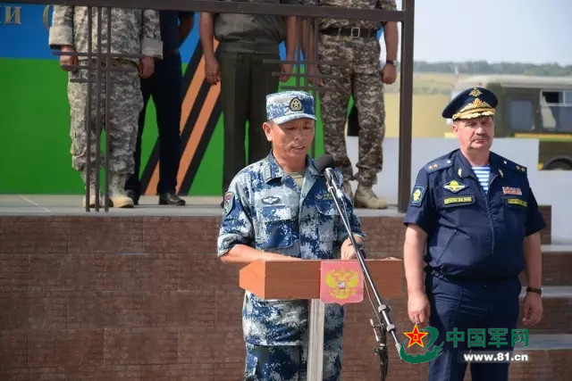 “空降排”中国参赛队领队刘甫清大校在庆祝仪式上致辞。