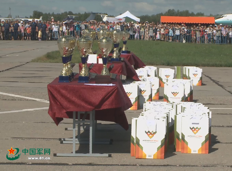莫斯科时间8月9日上午,俄罗斯“国际军事比赛-2016”之“航空飞镖”竟赛闭幕式在梁赞州嘉垓列袄机场举行,主办方俄罗斯空军为各国获奖飞行员颁奖。中国空军参赛队夺得轰炸机组第二名,获四轮越野摩托一辆。闭幕式现场,还举行了精彩的飞行表演。